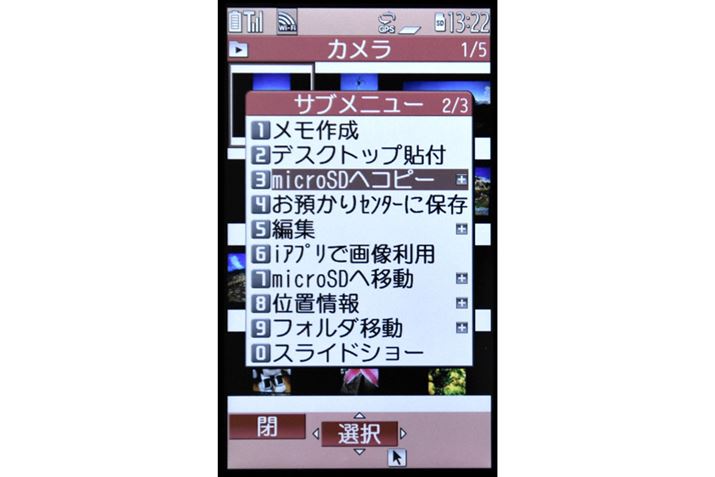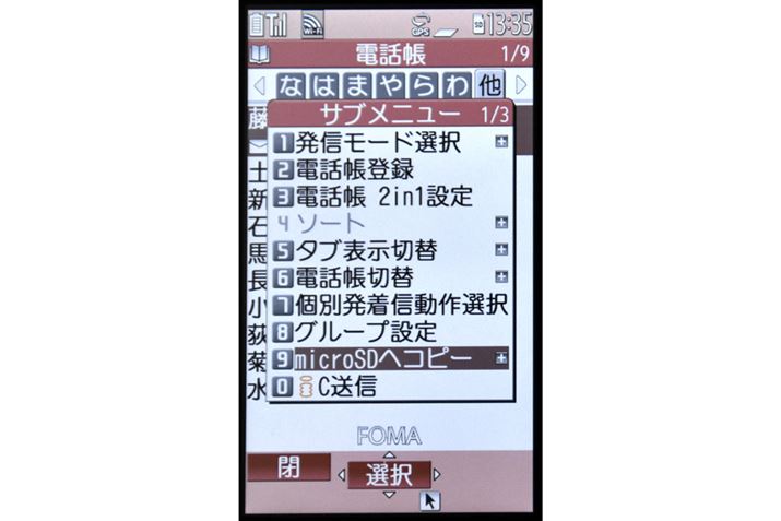 ガラケーで電話帳を開き、全データをmicroSDメモリーカードにコピーする。