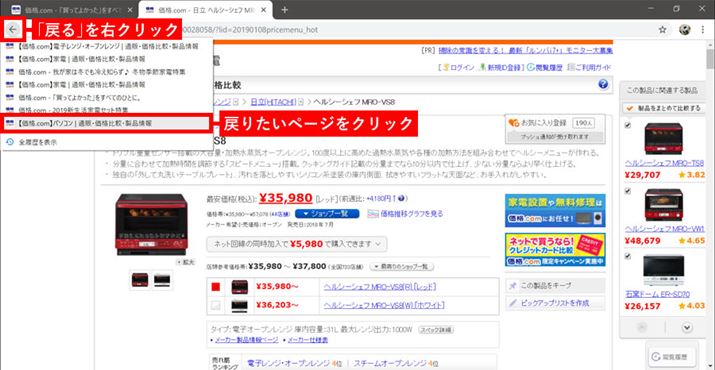 “このタブでさっき開いていたページに戻りたい”場合は、Webブラウザの「戻る」ボタン(「←」ボタン)を右クリックする。これまでそのタブで表示してきたページの履歴が表示されるので、そこで戻りたいページをクリックする。