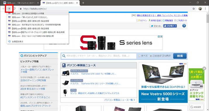 戻ったあとまた先ほどのページに移動したい場合は、「進む」ボタンを右クリックしてページの一覧の中から選ぶ