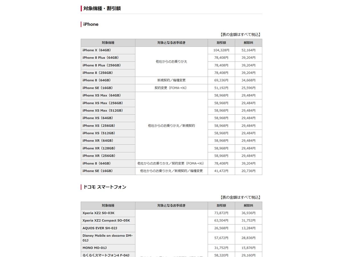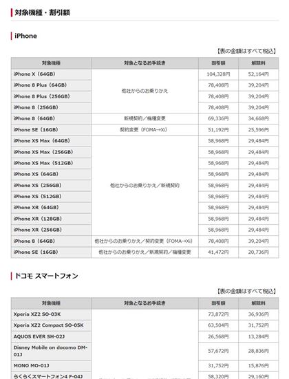端末購入サポートの例。高額な割引を受けられますが、解除料もかなりの額です(画像はドコモのWebサイトより)