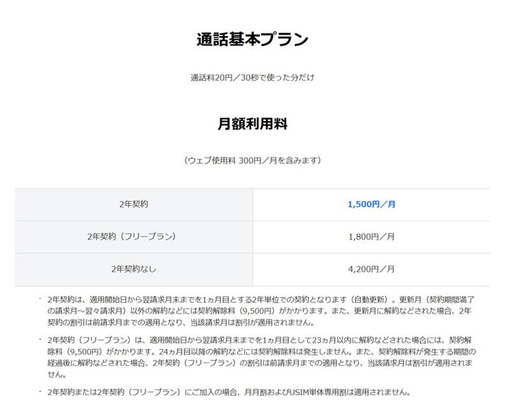 ソフトバンクの「通話基本プラン」では、2年契約の有無で毎月税込2,916円の差額が生じます(画像はソフトバンクのWebサイトより)