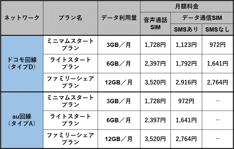 ネットワークはドコモ回線の「タイプD」とau回線の「タイプA」から好きなほうを選べます。タイプAのデータ通信SIMにはSMS機能が標準で付属しますが、タイプDは月額151円のオプション扱いとなっています。