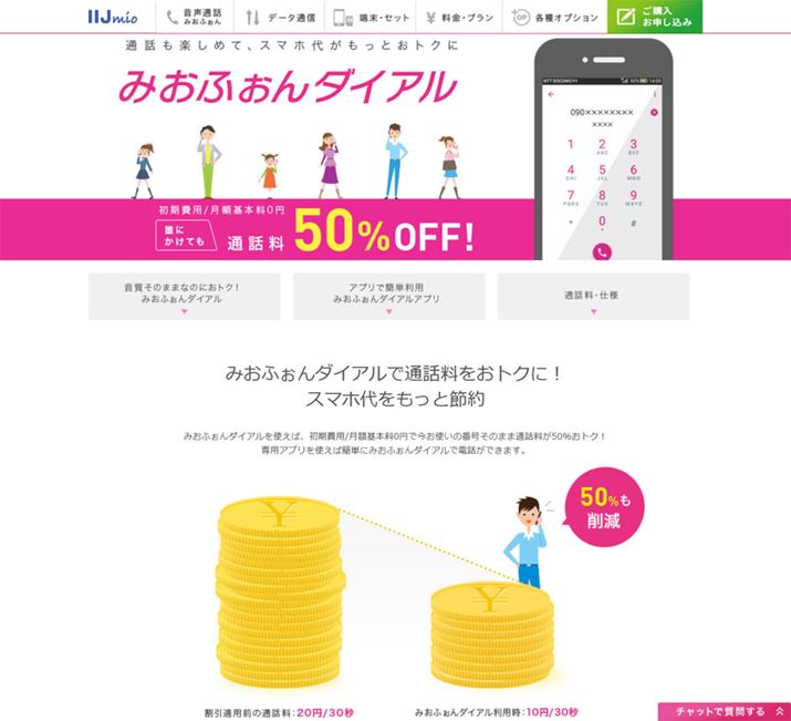 通話料が半額の30秒あたり10円(税別)になる「みおふぉんダイアル」は、家族間の通話料金が3割引になる「ファミリー通話割引」と併用することが可能です(画像はIIJmioのWebサイトより)