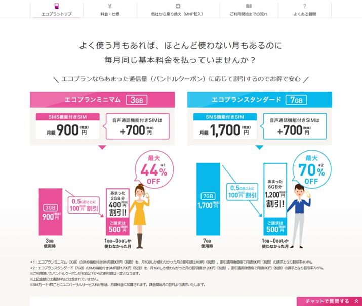 特徴は、余ったデータ利用量を翌月へは繰り越さずに、残量に応じた割引が受けられるところ。割引額は0.5GBごとに108円となっています。たとえばエコプランミニマムを契約中に、ある月のデータ利用量が1.5GB余った場合、その月の月額料金は324円(=108円×3)が割り引かれた1,404円(音声通話SIMの場合)となります。