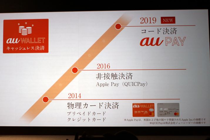 2014年にスタートした「au WALLET」は、クレジットカードのインフラを利用した「au WALLETプリペイドカード」、FeliCaポートを利用した「Apple Pay」に対応。今回加わった「au PAY」は第三の決済手段となる