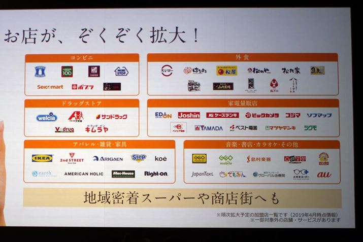 「au PAY」が対応する店舗は、コンビニエンスストアや外食チェーン店、ドラッグストア、家電量販店、アパレル・雑貨・家具、音楽・書籍・カラオケなど多岐に及んでおり、順次拡大する予定。また、今後、大手企業にとどまらず、クレジットカードや電子決済の普及が遅れている、地域に根付いた小さな店舗や商店街への浸透を図る。楽天の「楽天 PAY」と連携することで、早期に地点ベースで約100万か所の普及を目指す。