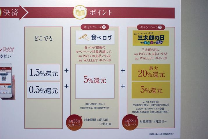 2つめのキャンペーンは、「食べログ」に掲載されたキャンペーン対象店舗で、「au PAY」を使って支払いを行った場合、200円で10ポイント(5%)もらえるというもの。対象期間は4月23日〜7月31日だ。なお、「au PAY」は1回の支払額の上限が5万円となっているので、その範囲での還元となる。