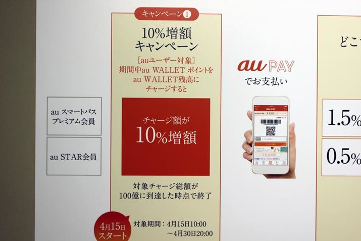 「au PAY」のサービス開始にともない、4月15日より3種類のキャンペーンが行われる。ひとつめのキャンペーンは、「au WALLET残高」にチャージしたポイント額に加えて10%のポイントを増額するというもの。なお、対象となるのは、4月15日午前10時〜4月30日午後20時までに行われたチャージだが、チャージ総額が増額部分を含めて100億に達成した時点で終了となる。また、このキャンペーンが適用されるのは、1名あたり2万円のチャージ(増額2,000ポイント)までという上限がある。