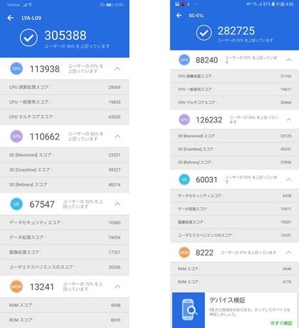 左が、現状最速と言われるファーウェイ「Mate 20 Pro」のスコア、305,388(CPU:113,938、GPU:110,662、UX:67,547、MEM:13,241)。右は本機と同じ「Snapdragon 845」の通常クロック版を搭載する「Galaxy Note9」のベンチマークスコア。総合スコアは282,725(CPU:88,240、GPU:126,232、UX:60,031、MEM:8,222)。オーバークロックの分だけROG Phoneのほうが16,000ポイントほど高いスコアになった。