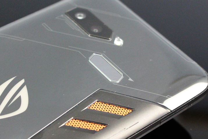 写真の下に見えるのはヒートシンクの排熱口。指紋認証センサーやカメラ周辺のデザインもゲーミングスマホらしいエッジの立ったもの