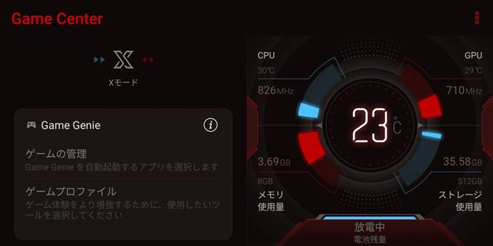 なお、本機には、「Xモード」という一種の処理性能最適化モードが用意されている。これは、バックグラウンドで動作するアプリのメモリーをいったん解放し、通知を制限するなど、ゲームアプリの処理にシステムリソースを集中させるものだ。また、アプリごとにSoCに含まれるCPUの動作クロックの上限を手動で設定することもでき、電力を手動で節約できる。