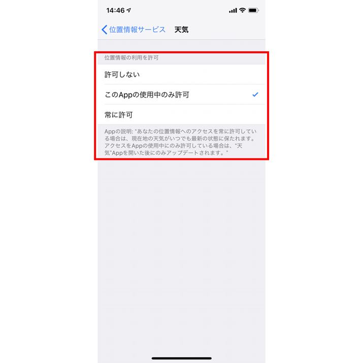 アプリをタップすると、「許可しない」「このAppの使用中のみ許可」「常に許可」が選べる。下部に表示される説明を参考にしよう