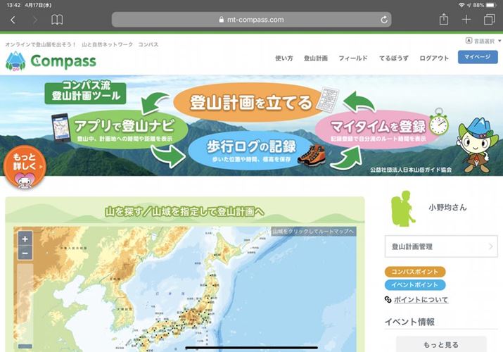「コンパス 山と自然ネットワーク」のホームページ。画面を下にスクロールすると、提供されるサービスの内容を閲覧できる(以下、画面はiPad Proの「Safari」の例)