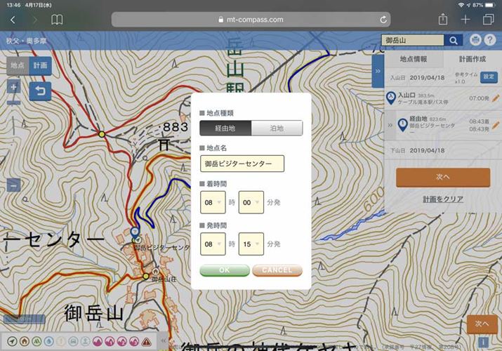 通過するだけなら発時間はそのまま、休憩を予定するならそのその分を加えた時刻を指定しよう。あとは、同様に通過ポイント、泊地などを指定していけばいい。このようにして、下山ポイントまでの登山ルートを設定する。設定できたら、「次へ」をタップする。
