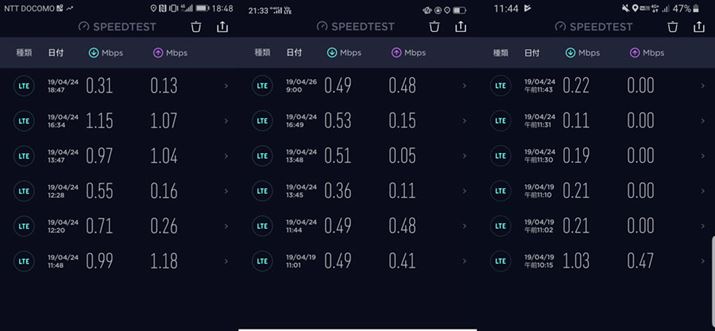 まずは、各SIMカードの実効速度を見てみよう。詳しくは下の写真を見て欲しいが、通信速度計測アプリ「Speedtest.net」を使って計測した結果としては、時間帯を問わず速度の上限値までのスピードは出ているようだ。なお、楽天モバイルは12〜13時、18〜19時の混雑する時間帯に限り通信速度が300kbpsに制限されるので注意されたい。