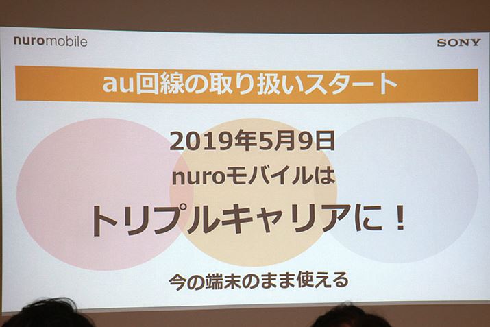 MVNOサービス「nuroモバイル」を提供するソニーネットワークコミュニケーションズは2019年5月8日、au回線を利用した新料金プランを発表した。これにより、nuroモバイルはNTTドコモ、ソフトバンク、auの国内大手3キャリアの回線を取り扱う、トリプルキャリア対応のMVNOとなる。
