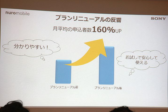 分離プランの導入で、伸び悩みが見られるMVNOの中にあって、nuroモバイルはプランリニューアルの影響で、月平均の申込者数が160%アップしているという(実数は非公開)