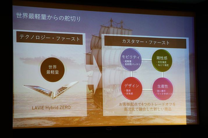 従来モデルのLAVIE Hybrid ZEROは世界最軽量にこだわった軽量モバイルノートだったが、軽さにこだわるあまり、バッテリー駆動時間やデザイン、剛性感など妥協せざるをえない部分があった。