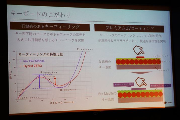 打鍵感のあるキーフィーリングにするため、キー押下時のピークフォースとボトムフォースの差を広げるなど、細かい部分までこだわっている