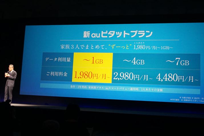 従来からあった「auピタットプラン」は「新auピタットプラン」にリニューアルされた。「新auピタットプラン」は、従来の5段階から3段階へと変更された段階制プランで、1段階目が毎月のデータ通信量1GBまで(月額2,980円)、2段階目が4GBまで(月額4,480円)、3段階目が7GBまで(月額5,980円)となる。毎月の通信量が1GB未満の場合、月額2,980円という料金は変わらないものの、後述する「家族割プラス」を組み合わせることで、月額1,980円という低料金が永続するのが特徴だ(旧プランでは契約当初1年のみのキャンペーン価格)。サービス開始は6月1日からとなっている。