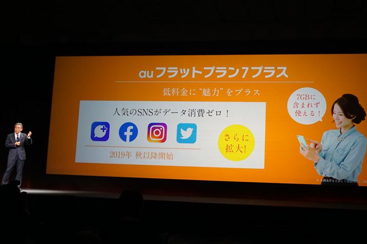 「auフラットプラン7プラス」は、月間7GBまで(月額5,480円)のデータ通信が可能というものだが、「+メッセージ」(SMS送信は有料)、「Facebook」、「Instagram」、「Twitter」の各サービスについては、7GBの通信容量に加算しないカウントフリーとなっているのが特徴。また、7GBを超過した場合の通信速度も2019年秋以降は最大128kbpsから最大300kbpsにスピードアップされる。なお、こちらのプランも「家族割プラス」と「auスマートバリュー」の組み合わせで、家族3人の場合、毎月2,000円が割引され、月額3,480円での利用が可能となる。