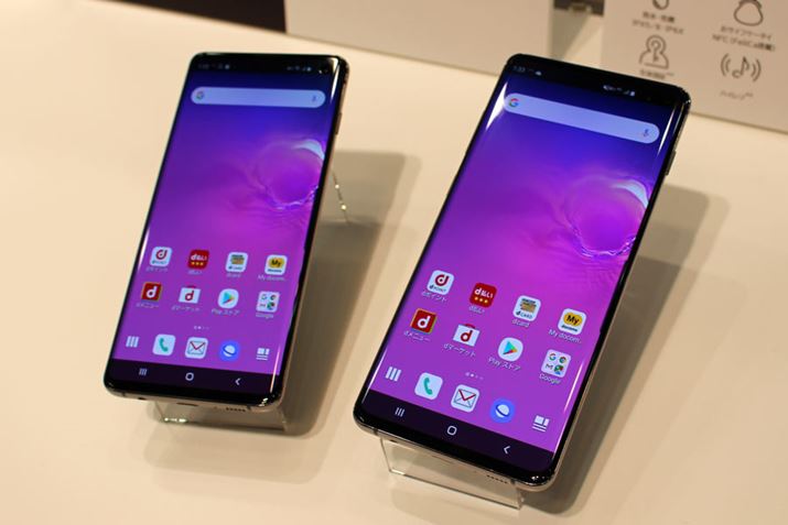 左が「Galaxy S10 SC-03L」、右が「Galaxy S10+ SC-04L」。サイズのほかには、フロントカメラが「SC-03L」ではシングルなのに対して、「SC-04L」はデュアルカメラという違くらいしかない