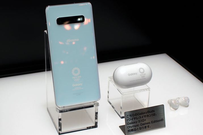 東京オリンピックの記念モデル「Galaxy S10+ Olympic Games Edition」。ベースモデル「Galaxy S10+」と比較すると、背面のロゴや専用の壁紙、専用のミニアプリ、ワイヤレスイヤホン「Galaxy Budz」が同梱されている点が異なる