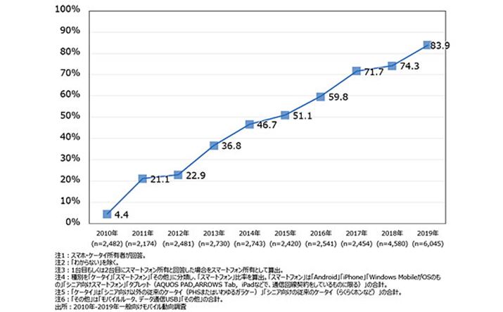 NTTドコモおよびモバイル社会研究所が、2019年5月21日に発表したレポートによると、日本国内のスマートフォン・携帯電話の所有者のうち、スマートフォンの所有比率が83.9%となったことが明らかとなった。両社では2010年よりスマートフォンの所有比率を調査しており、2010年では4.4%、2015年には半数を超える51.1%と順調に数値を伸ばしてきた。83.9%という数値は、昨年の74.3%と比較すると9.6%の増加で、初めて8割を超えたことになる。