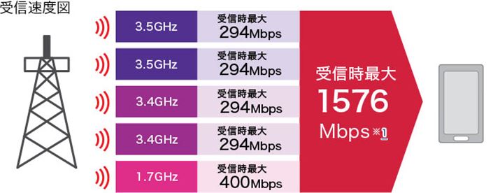 既存の3.5GHz帯(294Mbps)×2波と1.7GHz(400MHz)×1波に加えて、2018年4月に免許交付された3.4GHz帯(294Mbsp)×2波を組み合わせて下り最大1576Mbpsの通信速度を実現する
