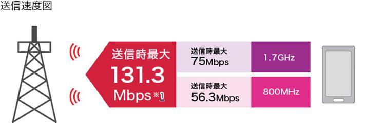上りの最大速度である131.3Mbpsは、1.7GHz帯(75Mbps)と、800MHz帯(56.3Mbps)の組み合わせで実現する。なお、電波の組み合わせはこれ以外にも複数存在する