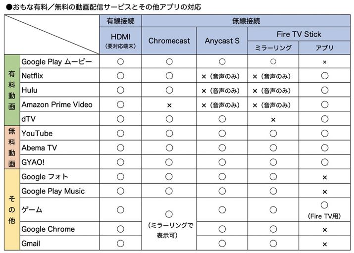 今回試した環境では、有線接続が最も幅広いアプリを表示できた。特に、主な有料・無料動画配信サービスを視聴できる点は注目だ。ただし、有線接続による映像出力に対応した端末である必要がある点は注意していただきたい。