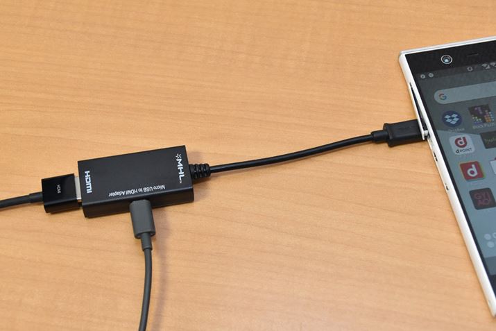 有線接続に使ったスマホは、MHL対応の「arrows NX F-02H」だ。MHL変換アダプターは、アマゾンで購入した「MHL to HDMI変換アダプタ(B07HMPV6DL)」(880円、Hoplaza JP)を使った。