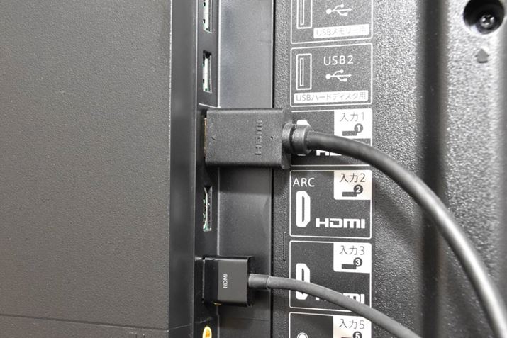 テレビのHDMI端子にHDMIケーブルを接続し、入力端子の番号を確認しておく。充電は、テレビにUSB端子があればそこから給電できる。今回、テレビのUSB端子とAC電源アダプタの両方で試したが、いずれも問題なく接続できた