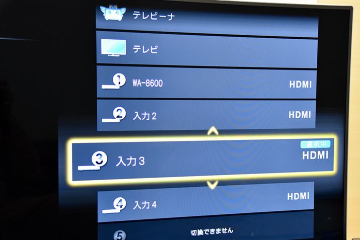 確認した入力番号に、テレビの入力を切り替える。これでスマホの画面がテレビに表示され、手元での操作がそのままテレビの表示に反映される。横向き対応のアプリはスマホを横向きにすれば、テレビの全画面に表示される