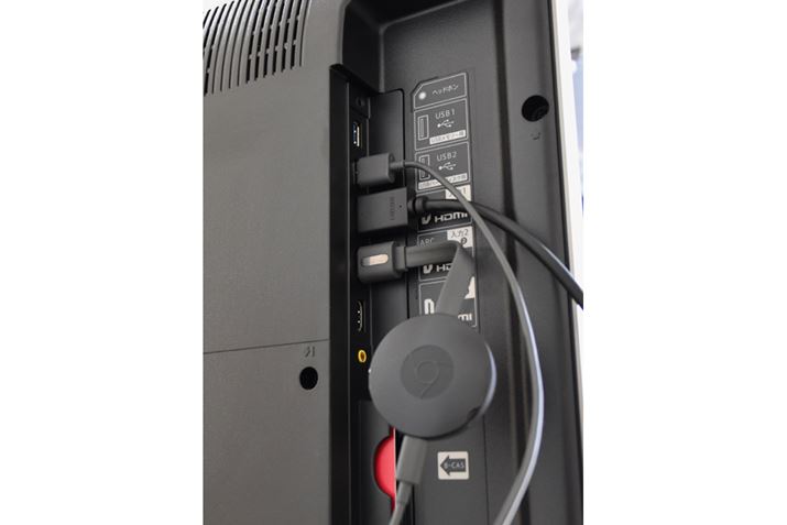 ChromecastをHDMI端子に接続し、電源ケーブルも接続。写真では、テレビのUSB端子から給電している。Chromecast本体側面にあるボタンを押して電源を入れる