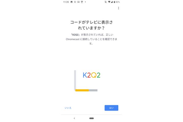 テレビの入力を切り替えると、設定画面が開く。「Google Home」アプリのインストールが促されるので、Android端末にインストールして起動する。Googleアカウントでログインすると、Chromecastが検索される。見つかったら、コードが表示される