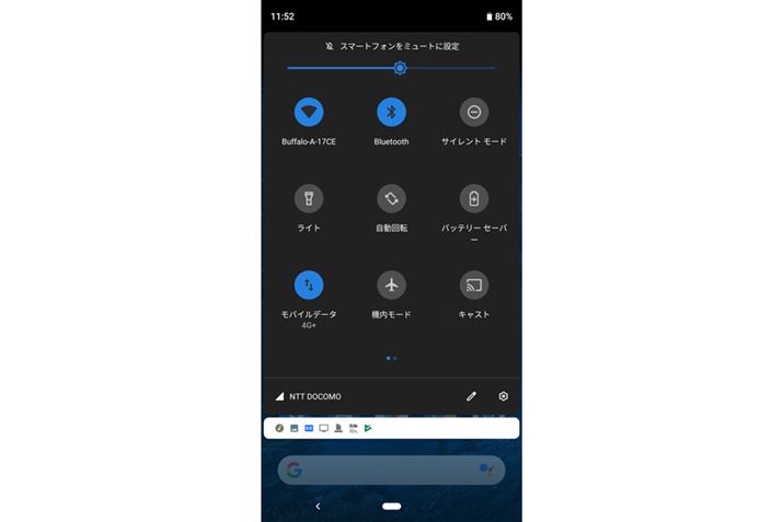 ホーム画面やキャストに対応していないアプリをテレビに映すには(ミラーリング)、クイック設定パネルを開いて「キャスト」をタップする