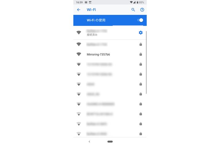 テレビの入力を切り替えると、設定画面が開く。まず、Android端末の「設定」→「ネットワークとインターネット」→「Wi-Fi」を開く。付属のマニュアルに従ってAnycast SのSSIDを選び、パスワードを入力したらAndroid端末とAnycast Sが直接、Wi-Fiでつながる