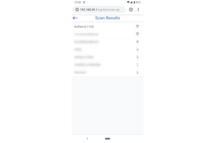 次に、Chromeで「192.168.49.1」にアクセスする。このIPアドレスは、Anycast S本体内の設定ページの場所だ。設定ページが開いたら、「Wi-Fi AP」をタップ。次の画面で「Scan」を選ぶとこの画面になるので、自分の無線LANルーターのSSIDを選択(5GHz帯は非対応)。次の画面で暗号キーを入力すると、Anycast Sが無線LANにつながる
