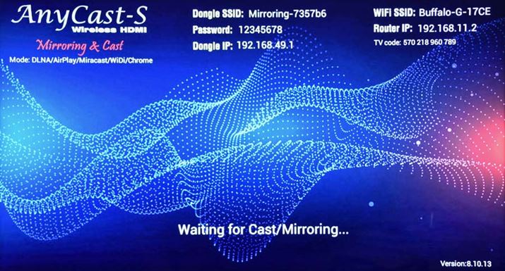 無線LANにつながると、テレビの画面右上にSSIDが表示され、画面下部に「Waiting for Cast/Mirroring...」と表示される。これで設定は完了で、待ち受け状態になる