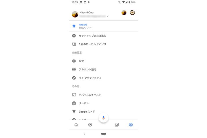 ミラーリングは、「Google Home」アプリから行う。「Google Home」を起動したら、画面右下のアカウント(人型アイコン)ボタンをタップ。「アカウント」画面が開くので、「デバイスのキャスト」をタップする