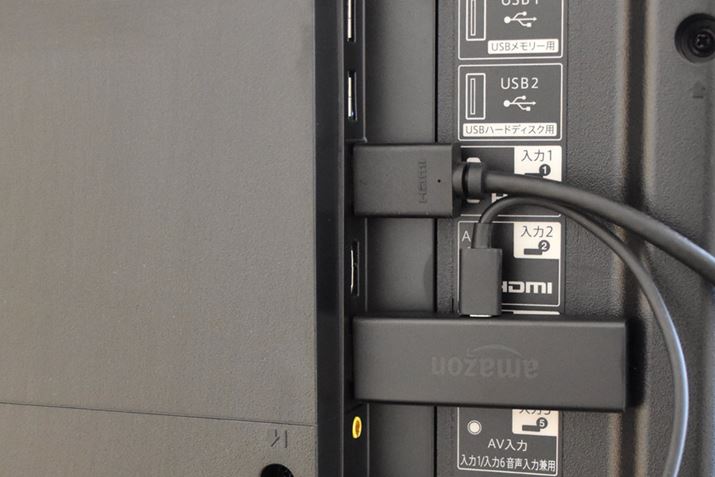 Fire TV StickをテレビのHDMI端子に直接接続する。電源も必要なので、付属のUSBケーブルとAC電源アダプターを利用しよう。今回、テレビのUSB端子から給電しようとしたところ、設定の途中で電力不足と表示が出たため、AC電源アダプターを利用した。