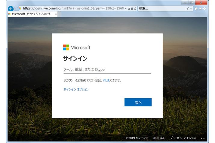 ブラウザーソフトで「Outlook.com」のページを開き、Microsoftアカウントでサインインする。持っていない場合には、「作成」をクリックすれば取得できる