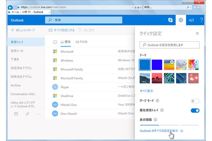 ブラウザーソフトで「Outlook.com」にサインインし、画面右上の「設定」(歯車アイコン)ボタンをクリック。メニューが開いたら、「Outlookのすべての設定を表示」をクリック