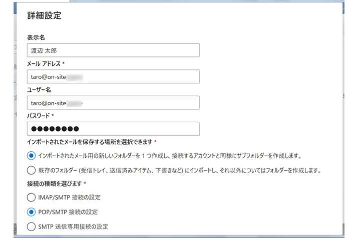 「詳細設定」画面が開くので、表示名、メールアドレス、ユーザ名、パスワードを入力。接続の種類は、追加するアカウントに合わせて選択する。一般的なプロバイダーメールであれば「POP/SMTP接続の設定」だ