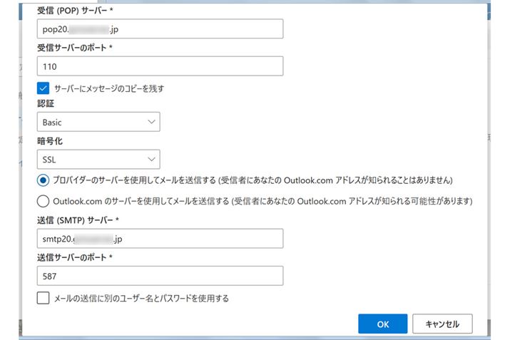 画面をスクロールし、受信(POP)サーバーと送信(SMTP)サーバーの設定をする。ここでの設定は、プロバイダー等が提供する情報通りに行うこと。設定できたら「OK」をクリック