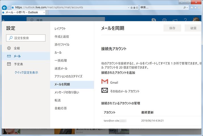 「Outlook.com」で確認すると、メールアカウントが画面左に追加されている