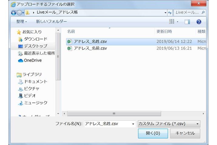 「アップロードするファイルの選択」画面が開くので、エクスポートしたアドレス帳データを選んで「開く」をクリック。ここでは、エクスポート時のフィールドで「名」「姓」を選んだ「アドレス_名姓.csv」を使った