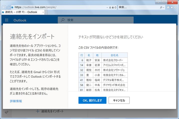 一部フィールドの中身が表示される。確認して「OK、続行します」をクリック。次の画面でインポートが完了したら、「閉じる」をクリック