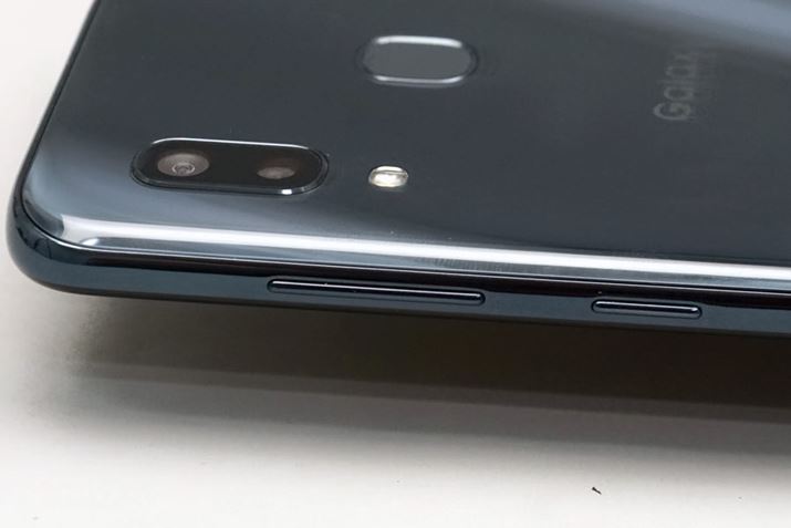 「Galaxy A30」は、2,340×1,080表示に対応する約6.4インチの有機ELディスプレイを備えた大型スマートフォンだ。ボディサイズは、約75(幅)×160(高さ)×8.0(厚さ)mmで、重量は約176gとなっている。ボディは、IPX5/8等級の防水仕様と、IP6X等級の防塵仕様をクリア。ディスプレイは、上部に水滴状のノッチが設けられているが、「Galaxy S10」や「Galaxy Note9」といった上位モデルとは異なり、オーソドックスな平面パネルである。